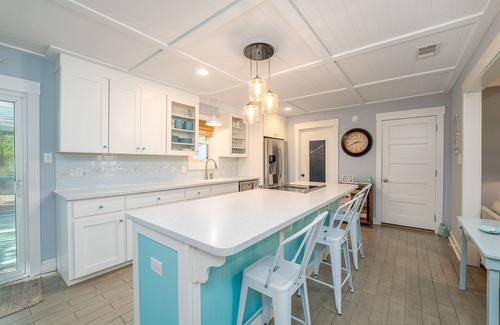 As you step inside, you'll be greeted by beach-inspired decor, cozy furnishings, and a large flat-screen cable TV in the welcoming living area. The kitchen is fully equipped with all the amenities a kitchen could desire, including a stunning breakfast bar accommodating three guests. The adjacent dining area offers seating for up to 6 guests and provides a lovely view of the porch and backyard. The laundry room, conveniently located off the kitchen, houses a washer/dryer and ample space for folding, ironing, and caring for your clothing needs.