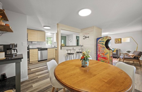 Our home is family friendly with pack and play, high chair, kids plate-ware, a multi arcade game, and a cabinet full of board games.