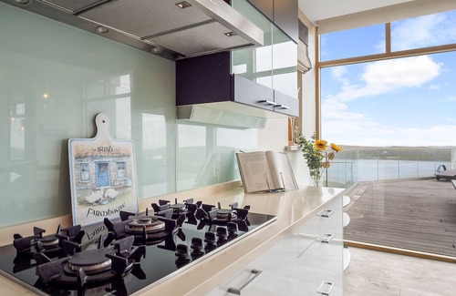 On the middle level, the kitchen, dining room and drawing room are all interconnecting. A double-sided wood burner forms a warm and inviting focal point, linking elegant living spaces perfect for both quiet relaxation and sophisticated entertaining. The fully equipped Poggenpohl kitchen is a culinary dream, stocked with everything you could possibly need, and opens onto a large dining table where unforgettable meals are shared against a backdrop of endless blue and green. Walls of glass turn every moment into a moving painting, from dawn’s soft golds to the fiery spectacle of Atlantic sunsets. Here, meals are more than sustenance; they’re centrestage events, set against some of the most cinematic views in Ireland.