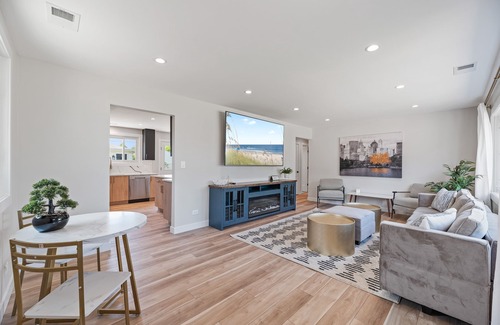 Fresh and fabulous, sleek and modern, & centrally located. This 3 bedroom 1.1 bathroom home was just renovated with all modern finishes and appointments. Gorgeous kitchen with all necessary amenities. Large family room with 85 inch smart TV, Xfinity, & electric fireplace. Two bedrooms with king sized beds. Kids bedroom with 2 twin beds. Full bathroom with large walk in shower and rain shower. Large yard with Gazebo and outdoor dining space. 2 car garage. Truly a fab house!