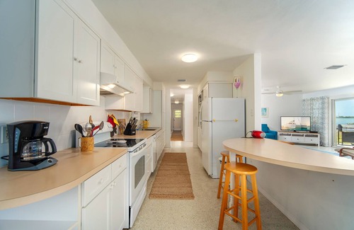 Great views of Sugarloaf Sound from this ground-level midcentury-era home that offers expansive sound frontage perfect for kayaking and paddleboarding, plus a dock on the canal to the side for your small power boat. Light and bright, with lots of windows throughout. Scandinavian-inspired furnishings. The kitchen is well-equipped, and you have your choice of dining inside or on the screened porch outside. There is 1 queen bedroom (master) and 2 bedrooms with 2 twin beds each, all with water views. Located at the end of a short, quiet street and boasting large front and back yards, this is the ideal spot for a serene waterfront getaway. The surrounding waters are great for boating, fishing, snorkeling, kayaking and paddleboarding. The neighborhood features excellent walking and bicycling paths, and there is a restaurant, tiki bar, convenience store and marina across the Overseas Highway from this quiet subdivision. Just 17 miles from Key West. Parking is limited, with room for 2 vehicles max.