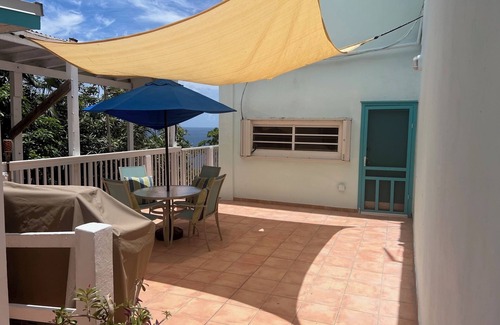 Suite Mango, is part of the Tranquility compound, and provides guests a bird's eye view of both the beauty of the Caribbean turquoise waters and as well the exotic, lush green of the land! Suite Mango in particular is nestled among many exotic fruit trees and plants. The suite, and entire villa is fully concrete, mason home, so very quiet. Access to Suite Mango is from the shared onsite flat parking area down a flagstone ramp to a private deck / porch / entry area.