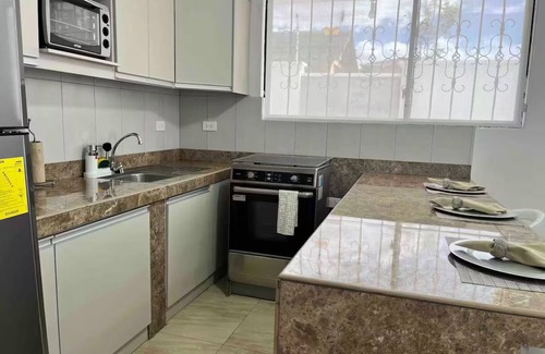 Amplia Suite de 2 habitaciones con 3 camas y baño completo. Cocina equipada, comedor, sala acogedora y zona de lavado con lavadora automatica y secadora ecologica. Incluye parqueadero privado, áreas verdes y BBQ.