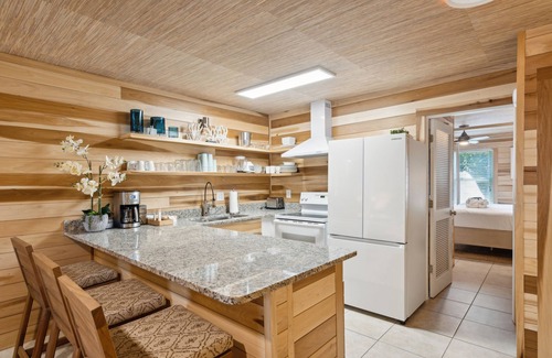Open living & kitchen room, renovated in a sleek tropical style. 1 bedroom with en suite bath, spa shower & custom shower product. This property lives like a boutique hotel, with local coffee provided along with hotel style linens & product. Outdoor covered seating area for 2. Private parking space. Everything you need for the perfect beach vacation!