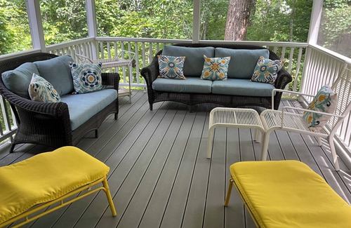 Downstairs there is a massive 40 foot Great Room with two fireplaces, two screened porches and a large deck. Lupine Lodge has a new remodeled kitchen with new stainless appliances (as of May 2025) and granite countertops. IT also has a large kitchen island with extra seating. Lupine has an oversized Weber gas grill on one of its decks with a direct gas feed so you will never run out of fuel! On this deck is a table with chairs that can seat 10, and a commercial picnic table that can seat 10-12, In addition, the screened porch which leads to the deck and patio has a large table with bench an that can seat another 8. So outside you can seat at least 26 next to one another as you dine. There is also another screened porch off the large Great Room with plenty of lounge seating.