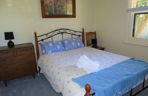 PROPERTY DETAILS: 2 bedrooms – queen, queen. Sleeps 4; Quilts & pillows provided; Sheets, pillowcases, towels and tea-towels included. Bathroom has bath & shower; Separate toilet. Reverse cycle split system air-conditioning in lounge room; Ceiling fans in bedrooms. Television with USB port in lounge room; CD player; Radio. Fully equipped kitchen & dining room with electric stove, microwave & fridge/freezer; Kitchen appliances including sandwich press, rice cooker & coffee machine (guests need to bring Nespresso-compatible pods or purchase locally). Front load washing machine; Iron; Ironing board. Outdoor seating & dining area on front verandah. Secure garage for storage or parking for 1 car; Off-street parking on either side of the house or at the rear; Room for up to 3 vehicles off-street including a boat, truck or trailers. Sorry, pets not permitted.