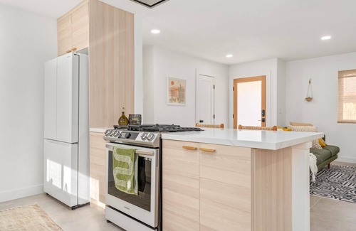 Located in the heart of Joshua Tree. Relax in the private backyard while enjoying the outdoor dining area, hot tub and hammocks. Warm up by the fire at night while stargazing the beautiful desert sky. The attached garage is equipped with a pool table that doubles as ping pong table, a large couch that stores a pull-out queen mattress and a large 65" Smart TV. The garage has heat and air conditioning for maximum comfort for watching a movie, sleeping, shooting some pool or playing ping pong.