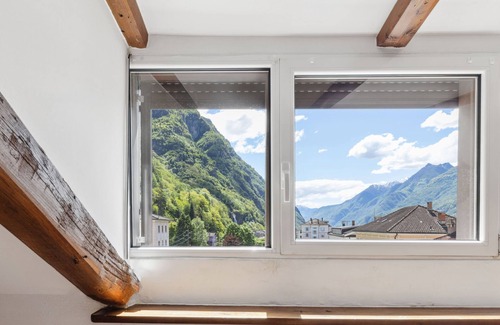 "Sunny Biasca", 2-room apartment 57 m2 on 2nd floor. Object suitable for 2 adults + 2 children. Bright, partly with sloping ceilings, comfortable and cosy furnishings: open living/dining room with 1 sofabed (120 cm, length 200 cm), cable TV, international TV channels, flat screen and air conditioning with 1 double bed (1 x 160 cm, length 200 cm). Open kitchen (oven, dishwasher, 4 ceramic glass hob hotplates, toaster, kettle, electric coffee machine, Capsules for coffee machine (Nespresso,mitbringen)). Shower/WC. Very beautiful view of the mountains. Facilities: Internet (WiFi, free). Please note: apartment street side. Non-smokers only. 1 pet/ dog allowed. NL-00009316