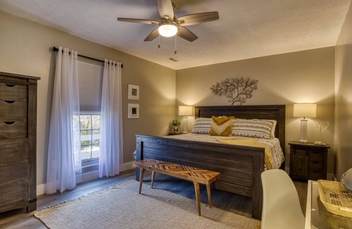 This is a unique 2 bedroom 1 bathroom fully equipped cabin. On entry level, enjoy the modern décor as you enter the cozy living room. There is a fully equipped kitchen with beautiful quartz countertops, and a roomy dining area. One bedroom offers a king-sized bed, the second bedroom has a queen-sized , and there is one full private bathroom. The living room also features an electric fireplace. If outdoor relaxation is what you are in the mood for, step out onto the covered deck and enjoy ample seating and an outdoor gas firepit. You are just minutes away from downtown Pigeon Forge and Gatlinburg, and of course, the Great Smoky Mountains National Park. Don't forget your favorite swimming attire and accessories to enjoy the nearby seasonal communal swimming pool.