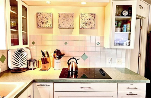 Kitchen is fully equipped with large and small appliances, along with dining table.