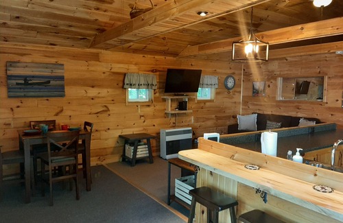 The interior of the cabin is beautifully covered with native pine boards. The living room, dining, kitchen and bar area all share an open space making it fun to cook and still interact with other guests or family members. The master bedroom has a king bed, flat screen TV and two closets. There is also a peekaboo window to watch the sun rise. The second bedroom has two full over full bunk beds and according to our sons, the best mattresses they've ever slept on. There are 3 large windows to view the pond and a sliding glass door to the deck.