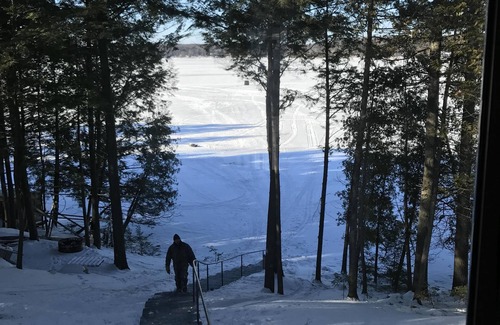 Vacation with your family in this beautiful lake home on Pickerel Lake. It has all the comforts of home, but steps away from outdoor vacation fun! Our lake home sleeps 12, has 3 full bathrooms, laundry room, 2 living rooms, a fireplace, a garage, and plenty of parking space. There is a concrete stairway with railing down to the lake, a concrete patio with gas grill, a lakeside fire-pit area with seating, a swim raft, and a dock for your boat. Across the road there is additional parking, a sand volleyball court, and another fire-pit area with picnic tables. The Pickerel area has lots of good fishing, water to swim and ski on, atv trails, a golf course, taverns, restaurants, and is close to Mole Lake Casino.