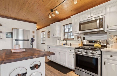 The cozy downstairs bedroom comfortably sleeps 2, while the spacious upstairs loft accommodates an additional 4 guests with one queen bed and 2 twin beds. The rustic unique charm of the interior is complemented by modern amenities, ensuring a comfortable and enjoyable stay for all.
