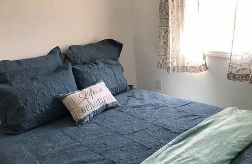 Two bedrooms each feature a queen-size bed. Additional sleeping space is available on a sofa and futon in the living room. The house can accommodate six guests total.