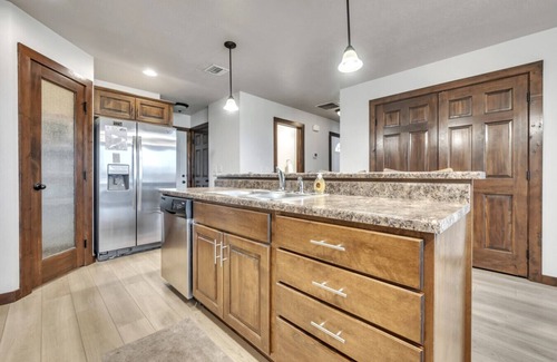 The property provides a primary bedroom with king sized bed, smart TV, and on-suite bathroom. The second guest room provides a full over full bunk bed with twin trundle and a smart TV, the third private bedroom (not a loft) has a queen bed, (toddler mattress in the closet), and a private deck with pool views. The bathrooms offer a stand up shower off the master, a tub/shower combo on the second level and a half bath on the main level. The kitchen is fully stocked with a dual Keurig and regular coffee pot. The garage is finished and ready for fun with a basketball hoop arcade system, smart TV, pub table, ping pong table, and wall bag toss.