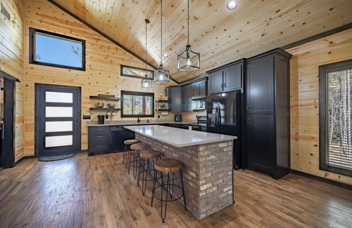 This modern and beautiful kitchen lacks for nothing. Enjoy the butler’s pantry which offers ample storage space for guest’s groceries (a rare find), and an extended kitchen island that seats 4. This cabin offers an abundance of counter space and cabinets which come fully stocked with all cookware and accessories to prepare any meal. We didn't stop at just basic cook wear. You will have the the extras to enjoy during your stay; XL air fryer, toaster oven, snack boards, cast iron skillets, bar accessories, whisky glasses and more. Located off the kitchen is a half bath complete with full size washer and dryer. Laundry pods and dryer sheets provided for guest.
