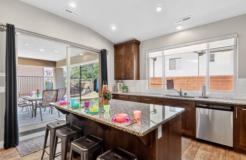 Guests will have full access to the exclusive Paradise Village at Zion property, including a resort-style swimming pool and Kids’ Cove water park with the only lazy river in the St. George area. The community clubhouse features a fitness room. The home is next to walking, biking, and hiking trails, Snow Canyon State Park, ten minutes from downtown St. George and an hour from Zion National Park.