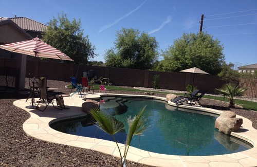 The home is fully furnished with each room having a queen sized bed. The living area includes large screen TV with Blue Ray DVD and access to 100 of cable channels. A separate den area for reading and relaxing is just off the kitchen and may be used as additional room, sleeping 2 additional guests w/ put away mattresses. The Kitchen is fully stocked with pots, pans and serving materials. Kitchen and bathrooms have recently been upgraded with granite countertops throughout. French doors have also been installed in the master bedroom leading out to the pool. Finally, the outdoor patio has been expanded to include new patio cover...the backyard is spectacular.