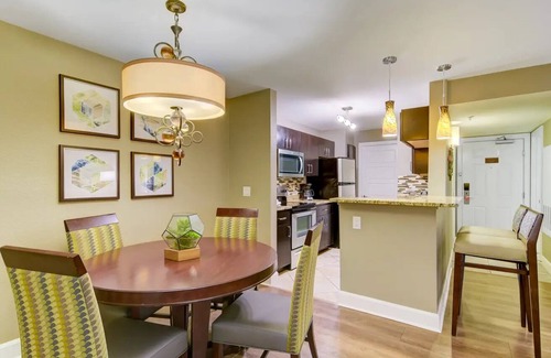Comes with a fully equipped and operational kitchen, pantry with ample storage space, full size washer and dryer, Gold Mine Bar and Grill for excellent dining, private balcony/patio that overlooks Vegas, dining room table that seats 6, Plasma TV in living room and bedroom, 2 fully equipped Fitness Center on property, arcade, 5 luxurious pools and marketplace to get drinks/snacks.