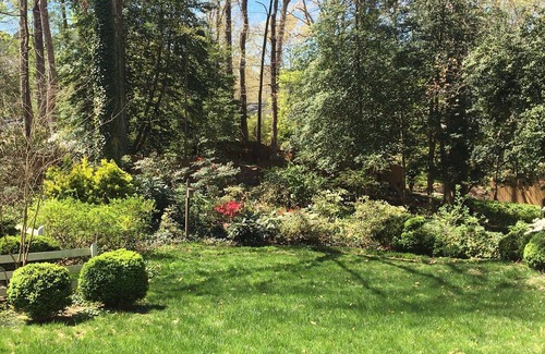 Newly renovated and spacious lower level flat with off-steet parking pad, brick fireplace, and wood plank floors. Large living room opens to kitchen and dining area and has a huge sectional couch with great views through large windows. Kitchen has granite breakfast bar, new stainless steel appliances and tiled splash. Nice corner office space and desk with built-in shelves. Fios internet, 55" TV. Master suite with new queen bed and new hybrid mattress, and 2 closets. Tiled bath with tub shower. Full size washer & dryer in the apartment. Garage parking available for one car. Beautiful garden views. access to patio and grill. Lovely neighborhood for hiking , biking and canoeing / kayaking around the James. Houguenot Flat Water landing is 1.5 miles from house.