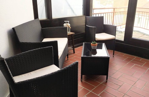 The centerpiece is the spacious, bright living room with a comfortable double bed (duvets and bed linen are provided), a stylish leather sofa that can also be used as a sofa bed, a 50-inch TV, a bistro dining table and access to the winter garden with poly rattan furniture and to the balcony with a view over Eschweiler.