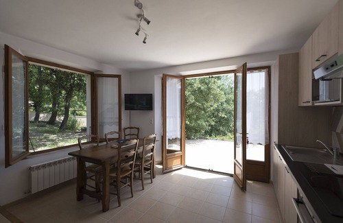 Entrance hall with hallway, wc, large lounge / dining room with two wood stoves. This luminous living room opens to the south onto the terrace and the swimming pool. Spacious independent kitchen fully equipped with dining area and fireplace insert, storeroom / laundry room, office area.