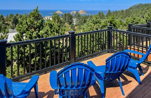 Enjoy amazing coast views while relaxing at your three-story home nestled in a peaceful neighborhood. The panoramic ocean sunsets and star-filled sky will take your breath away. Your retreat accommodates families and friends seeking relaxation and adventure. Unwind in the spacious open living room and kitchen, perfect for entertaining. Relax in your three comfortable bedrooms: Large primary bedroom with a king bed, en suite bathroom, and deck; a queen bedroom with en suite bathroom; and a large bedroom with two twin beds.