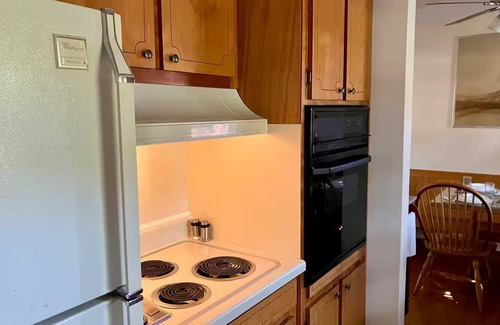 Inside, you’ll find two comfortable queen bedrooms—one with blackout shades and a ceiling fan, and the other with a private half bath and workspace. A third bedroom features a cozy twin bed. The full bathroom includes a washer/dryer, and the kitchen is well-equipped with a dishwasher, microwave, coffee maker, and quality cookware.
