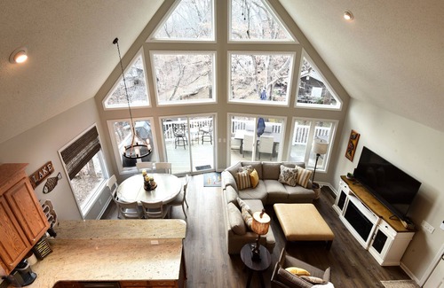 3 bedroom, plus loft, 3 bath home! Lots of light with a wall of windows in the great room, overlooking a wrap around deck with views of the lake. Large finished basement with picture window overlooking the lower level patio. The dock has a full sundeck on the top. Separate two car garage with parking for up to 4 cars. Home is fully fenced/gated in, perfect for families with small children! Bring Your boat! Relax at all 4 firepits! Watch the sunset over a game of darts or cornhole on the patio!
