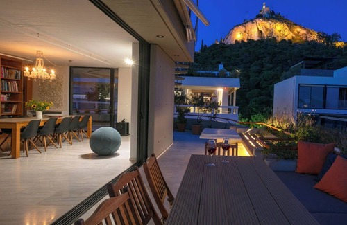 A unique modernist-style penthouse with a rooftop pool and breathtaking views of the Acropolis and Lycabettus hill, located in the safest part of the chic Kolonaki area. 320 sq m over two floors, an ideal choice for a luxurious private, centrally located, stay. At walking distance from every major attraction of Athens and yet off-beat and tranquil. Sleeps 6 adults and 4 children or younger adults.