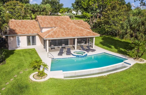 This villa is a paradise where nature, peace and luxury combine! Villa 101 is the only villa available for rent by Olsen Lake, a magnificent natural lake with a rich wildlife such as Sandhill Crane, Raccoon and Armadillos. Our pedal boat comes with the house and is yours for discovering the beauty of Olsen Lake and its inhabitants! But you can also enjoy the view from the fully renovated overflow pool, the protected veranda or the master suite soaking tub if you prefer! Our villa accommodating up to 8 people thanks to the pull out couch in the living room - has plenty of sun from morning to evening with wonderful sunsets on the lake. The spacious patio with sun deck chairs and side tables by the pool with attached Jacuzzi or inside the Lanai with a big dining table, gas and charcoal barbeques will make you never want to leave again! Decorated with light colors, beautiful furniture, spacious leather sofa and various pieces of art, the interior of the house is also perfect for rainy days or fresher evenings! One of the rooms has a beautiful view on the garden, the others on the lake and the pool. The kitchen is fully equipped with various kitchen utensils, dish washer, oven and a brand new fridge with plenty of space in case you want to prepare a special meal. Of course, the house has also a powerful Wi-Fi! If you are looking for calm and nature, but in an exclusive and spacious villa, this should be your pick!