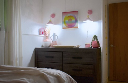 Pick your favorite bedroom depending on your personality! Are you boho chic and love atmospheric neon lights or do you prefer rustic and organic vibes? Either way, you will be cradled with luxurious comfort in our professionally dressed beds outfitted with the finest linens that are clean and cooling. The rooms also have plenty of storage with full closets and large dressers to organize your items and make you feel at home.