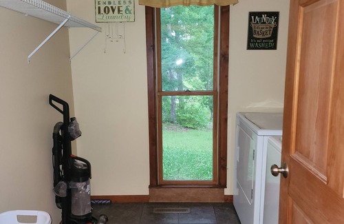 The large cozy kitchen is fully equipped with all your cooking needs, including full size fridge, dishwasher, microwave , and stove. It has a beautiful island with seating and is adjacent to the dining area that has a custom table for family dinners. There is also a table off the living room that allows seating for 4 more guests.