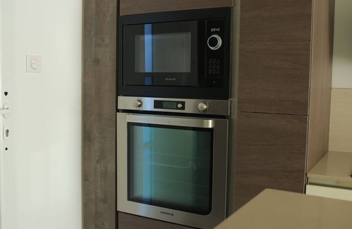 A new Mobalpa Kitchen fully equipped for your culinary desires with a brewed heat oven, a microwave, a food processor, an American fridge with fresh water and ice dispensers. A cooker hood is of course present to evacuate the smell of your preparations using the combined gas and induction hob.