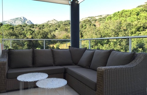Located on the heights of Calvi, quiet in a green setting, this 45 m2, air-conditioned apartment with 20 m2 terrace offers a magnificent mountain view.