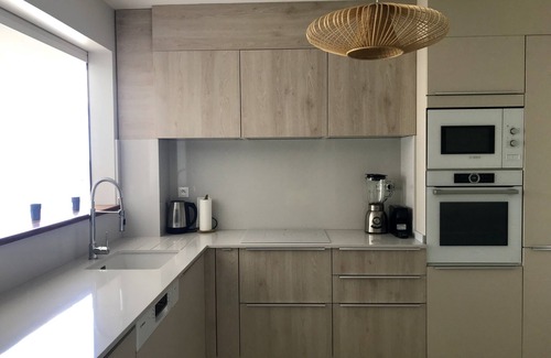 The very well equipped kitchen with its bar opens onto the large living room and terrace while enjoying the view.