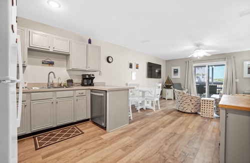 The first level has the living room (with sleeper sofa and 65" smart TV), deck with grill and outdoor seating, dining area that seats 6, fully stocked kitchen, full bathroom and bedroom with queen bed (there is also a rollaway bed in the closet). The stairs off the deck will take you to the beach access - less than 100 steps separate you and your toes in the sand!