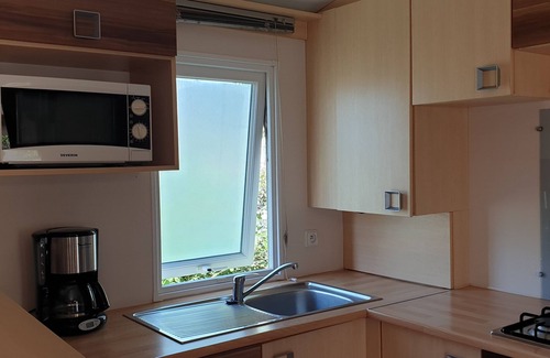 Mobile home of 45 m2 equipped: 2 bathrooms and 2 toilets, 3 bedrooms (one with double bed and bathroom wc for parents); convertible sofa. A TV, garden table with 6 chairs, barbecue, 2 deckchairs.