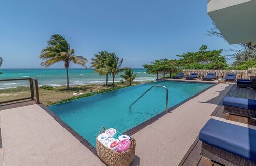 OMG! Book ONE WEEK and you will receive ONE COMPLIMENTARY ROUND TRIP AIRPORT TRANSFER FROM Montego Bay AIRPORT!! 7 BEDROOMS- BEACHFRONT! There's 24 hrs. security so your safety gated community is ensured as you leisurely walk along the long stretch of soft powdery white sands and turquoise clear water.
