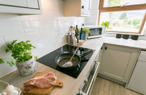 The owners, who live next door, have designed the house to be a warm and welcoming base for anyone visiting the area. There is private parking and a sheltered garden with views over the hills from the lawned area or from the terrace outside the patio doors. Step inside and the bright living room is off to the left with access to the garden, off to the right is the spacious modern kitchen with dishwasher, dining table for 6 and every essential. Upstairs, the main bedroom has a beautiful ensuite shower room as well as a balcony to soak the amazing views outside. Across the hall is the family bath/shower room and beyond another bedroom with three comfy single beds (two can be joined together to make a Double-size bed on request).