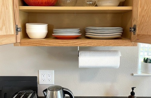 The Tangerine Lodge gets it's name from my beautiful tangerine colored couch that adorns the living room. When you walk in the door, you will want to go sit and relax under the high ceilings. From there, you can click on the electric fireplace either for heat, or ambiance, and watch the new flat screen TV.