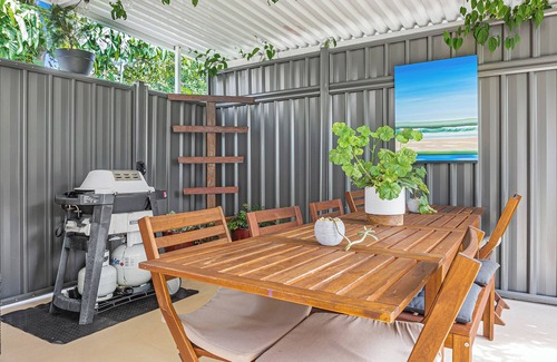 The back entertainment area is very private and well equipped, has a BBQ, outdoor seating for 8, sun lounge chairs and a nice garden outlook.
