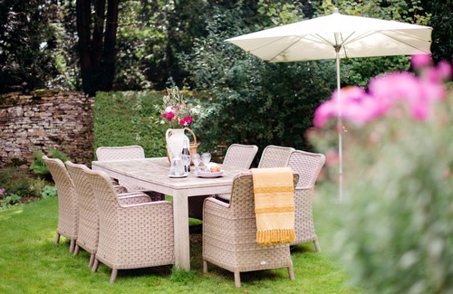 To the rear of Temple Guiting Cottage is a wonderful, enclosed garden. A drystone wall surrounds the space along with lofty, mature trees. The flat lawn is perfect for garden games, whilst the spacious 8-seater solid wood dining table lends itself to lazy lunches in the sun. Or maybe just have a little afternoon snooze in one of the basket chairs.