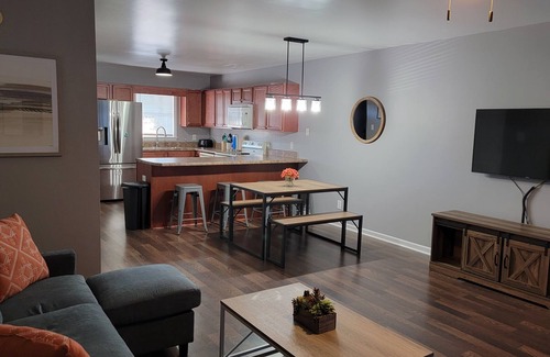 2 stories, private bathroom with each bedroom. Queen beds. 2 smart TVs with fire sticks. Fully stocked kitchen. Washer and dryer adjacent and private. So close to the beach but far away from the noise. Grocery stores, Starbucks, fast food and restaurants nearby.