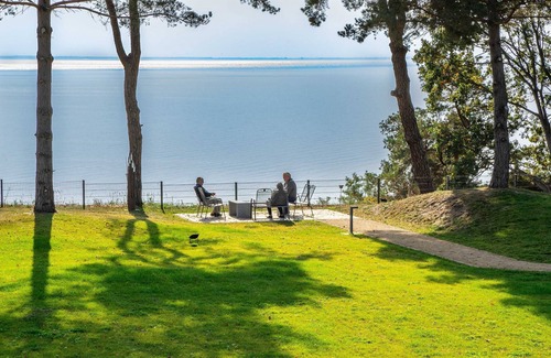 The "Oase am Haff" welcomes you to the sunny island of Usedom! Sea. Quiet. Experience. We are pleased that you are spending your valuable vacation days with us. Our holiday complex offers you luxury. Large sun terraces offer a wonderful panorama directly on the Szczecin Lagoon. A sea larger than Lake Constance. The fantastic view of the sun sparkling water will enchant you. All terrace apartments and apartments are of high quality and modern. Wide lawns with landscaped walkways surround our holiday homes on a large outdoor area. Separate terraces with seating on the cliffs invite you to linger. You can experience wellness, fitness, games and socializing in our common rooms, the equipment of which is available to you free of charge. We also offer professional massages that you can book with us. A large outdoor playground with climbing tower, cable car and play equipment invites you to your children's adventures. There is a soccer field outside the facility. Our boules alley or the common room for fitness and table tennis are available for your sporting experiences. You can reach the restaurant "The Red Baron", which we run, in relaxed style in the style of aviation romance. It is located at the spectacular aircraft exhibition “Hangar 10” and at Heringsdorf Natural Airport. Fine food and selected drinks await you there. In the bistro of our restaurant "The Red Baron" you get freshly baked rolls or homemade cakes every day, which you can enjoy with a cup of coffee on the restaurant terraces. The associated minimarket offers you not only coffee, milk, drinks but also care products. We have a bike rental that also offers e-bikes and scooters. You are welcome to bring your bicycles with you and to store them safely in lockable bike rooms. Your dog is welcome with us. In our facility we ask you to leash your dog. Outside our premises, wide fields and meadows offer the possibility for a safe and free run. The unique Usedom Baltic Sea beach can be reached by car in a maximum of 15 minutes via the famous imperial baths Bansin, Heringsdorf and Ahlbeck, not far from us. You will reach the Korswandt golf course in about half the way. Quieter sections of the beach are in Swinoujscie. We can particularly recommend a visit to the quaint fishing village of Kamminke with its beach on the Haff coast. The open-air restaurant at the harbor offers fresh fish cuisine and a place in front of breathtaking sunsets.