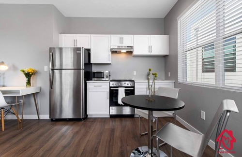 The stylish Studio includes a Queen bed, couch, large smart TV, sitting area and a work desk. There's a separate bathroom with a shower/bath combo. The kitchen is fully stocked and includes a full-size electric stove/oven, a full-size fridge and all your cooking requirements for the nights you want to stay in.