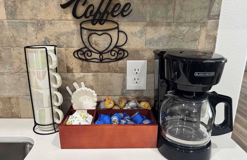 The home is the right side of a duplex. The front door leads into the open concept living area/kitchen/dining area. The two bedrooms and full bath are just a step off the main living area. Each bedroom has its own smart TV loaded with all the streaming apps.