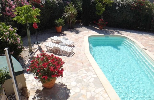 On the outskirts of the village at 800 m all amenities, cottage on the ground floor of villa completely independent of the owner with private entrance and closed 300 m² garden, salt pool private unopposed (9mx4, 5mx1, 5 m secured by alarms and gates). Terraces, living room of garden, barbecue, deck chairs. Closed parking. Wi-Fi access. SOUTH WAKE PARK (water skiing) at 300 m, Mas de Escaravatiers (music festival) at 400 m, adventure park at 1 km. Railway nearby. FOR 4 PEOPLE PREFERENTIAL TARIFF IS € 400 PER WEEK FROM THE 01.10.2016 TO THE 30.04.2016. Ground floor: equipped kitchen opening onto terrace, large living room, a bedroom with 1 large bed 140cm and corner shower and washbasin, bedroom with 1 large bed 160 cm, a room with 1 bed (140 cm) and 1 single bed 90 cm, shower room, 2 wc. Free bed linen. Fans.
