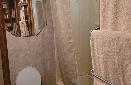 Across from the 5th wheel is a large restroom with a combination washer and dryer for your use should you need to wash clothes.