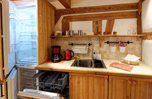 Accessible by a wide and comfortable staircase re-built to modern standards - this apartment offers space and comfort with a unique charm, romantic and unusual. It opens to the four cardinal points. A large bow window facing south connects the sitting and dining areas, in front of the roofs of the old medieval village of Riquewihr.
